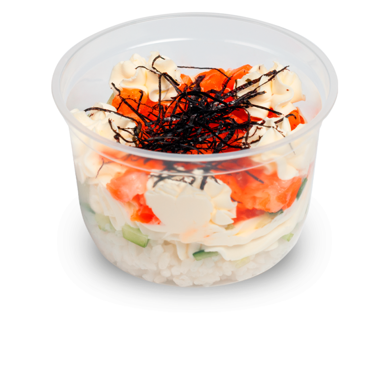 Rice, salmon, cream cheese, nori, cucumber, sweet chili mayonnaise